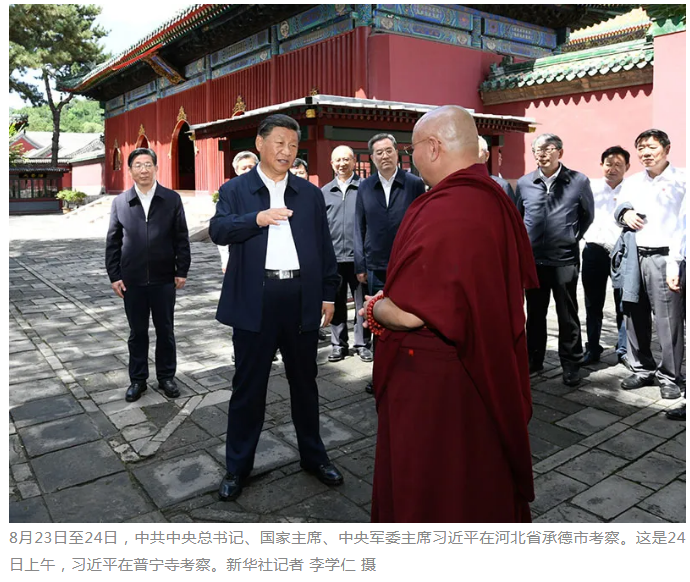 离开避暑山庄,习近平前往普宁寺考察调研。普宁寺始建于1755年,属于典型的汉藏合璧式寺庙。习近平仔细察看有关历史碑刻以及天王殿、大雄宝殿等建筑,听取宗教工作等情况汇报。习近平强调,要坚持党的宗教工作基本方针,坚持我国宗教的中国化方向,积极引导宗教与社会主义社会相适应,坚持独立自主自办原则,全面贯彻党的宗教信仰自由政策,弘扬爱国爱教优良传统,创建良好宗教环境,依法依规管理宗教事务,促进宗教更好顺应社会、服务社会、履行社会责任。