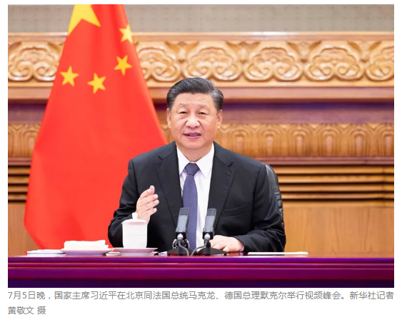 国家主席习近平5日晚在北京同法国总统马克龙、德国总理默克尔举行视频峰会。