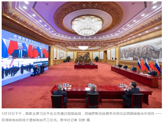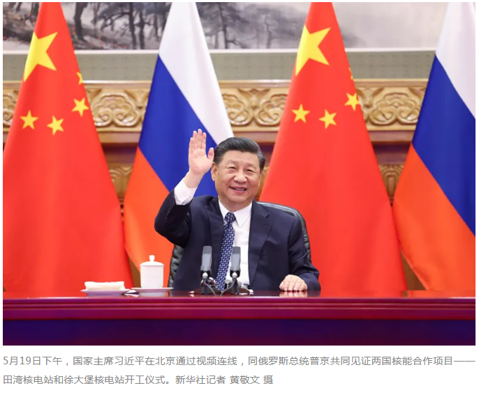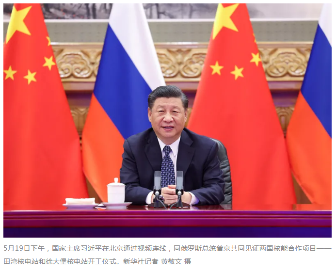 5月19日下午,国家主席习近平在北京通过视频连线,同俄罗斯总统普京共同见证两国核能合作项目——田湾核电站和徐大堡核电站开工仪式。新华社记者 黄敬文 摄 习近平强调,能源合作一直是两国务实合作中分量最重、成果最多、范围最广的领域,核能是其战略性优先合作方向,一系列重大项目相继建成投产。今天开工的4台核电机组是中俄核能合作又一重大标志性成果。习近平提出三点希望。
