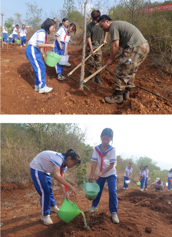 随后,全体人员分组开展了义务植树活动。在植树现场,大家积极参与、干劲十足,挖坑种树、铲土培实、提桶浇水,大家分工明确,合力将一棵棵树苗植入树坑,用实际行动践行“绿水青山就是金山银山”的发展理念。