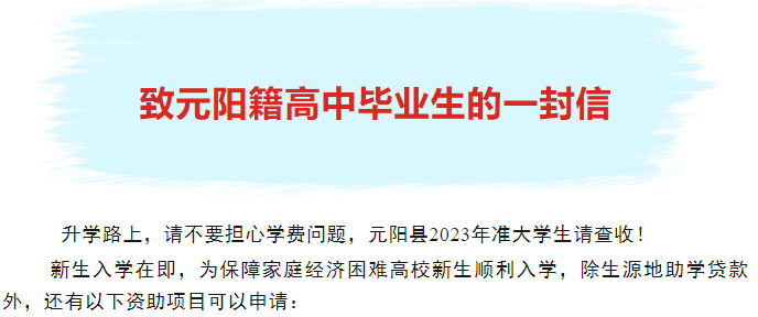 资助对象:1.当年参加高考取得专科和本科的优秀贫困学生。2.学籍在元阳县的学生。