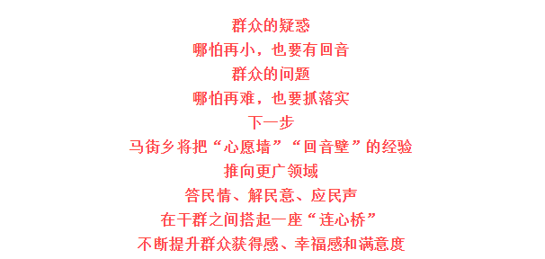 为畅通社情民意,解决基层组织建设的重点问题和关乎群众切身利益的现实问题,马街乡牛街村在村内醒目位置设立“心愿墙”“回音壁”板块,将群众在“心愿墙”提出的意见建议、反映的问题,全部列入“回音壁”,实行“销号式”清单管理,保障群众诉求件件有回应。