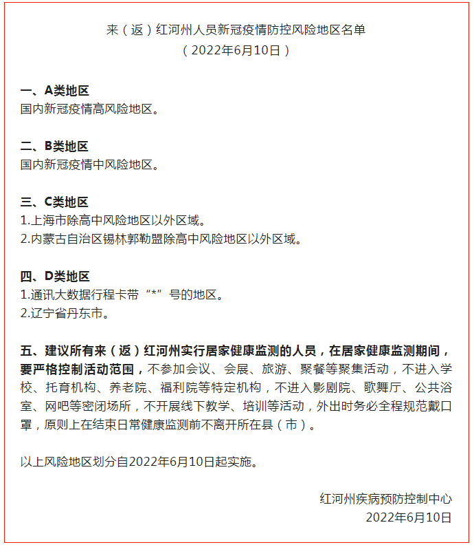 根据国内疫情形势变化,对来(返)红河州人员按照风险等级划分为A、B、C、D四类地区,分类采取差异化管控措施。A、B、C、D四类地区的划定由红河州疾病预防控制中心适时动态调整公开发布。