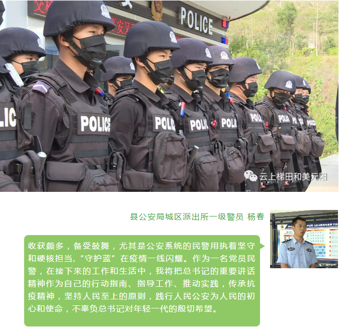 县公安局巡特警大队四级警长戈云山说:“我倍感振奋,在今后的工作中,我将继续发扬习近平总书记在全国抗击新冠肺炎疫情表彰大会上的重要讲话精神,始终坚持人民至上,生命至上,为人民群众的生命安全和身体健康不惜一切。 ”