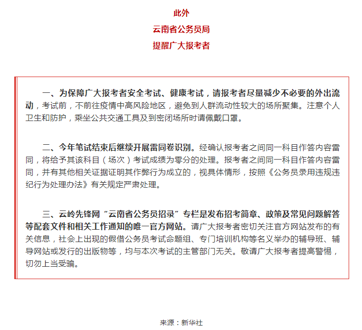 (一)云南省公务员招录官方网站为云岭先锋网云南省公务员招录专栏(http://www.ynylxf.cn/topicweb/ynskslygwy/index.html)。因查看其他渠道的错误信息造成的报考失误,由报考者自行负责。