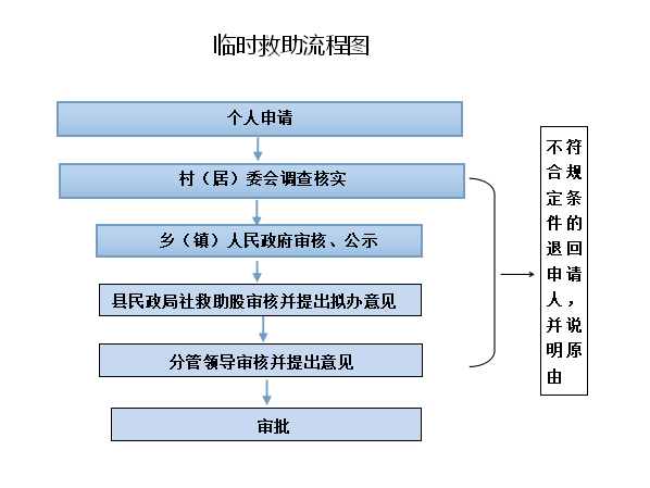 由本人向村(居)民委员会提出申请,村(居)民委员会调查核实,符合条件的报乡(镇)人民政府审核并张榜公示,对符合条件且无重大异议的,提出审核意见后报县民政局审批。不符合条件的及时通知申请人。