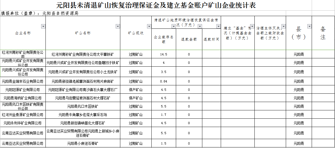 2、《元阳县未清退矿山恢复治理保证金及建立基金账户矿山企业统计表》。