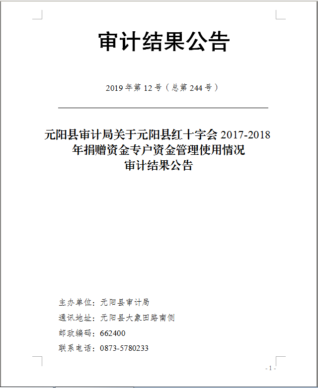 根据《中华人民共和国审计法》第二十三条规定,元阳县审计局派出审计组,自2019年3月26日至2019年6月 10日,对元阳县红十字会2017-2018年捐赠资金专户资金使用管理情况进行了专项审计。现将审计结果公告如下: