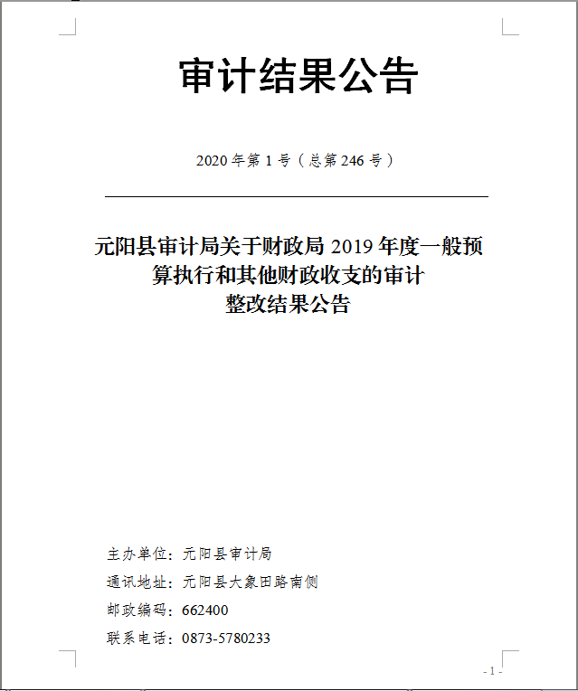 根据《中华人民共和国审计法》第十七条,以及云南省审计厅办公室关于印发《2020年财政预算执行和其他财政收支情况审计工作方案》的通知(云审办通〔2020〕13号),元阳县审计局派出审计组,对元阳县财政局组织征收和负责支出安排的2019年地方公共预算收支、基金预算收支以及有关科室专户资金收支管理情况进行了审计。现将审计查出问题整改情况公告如下: