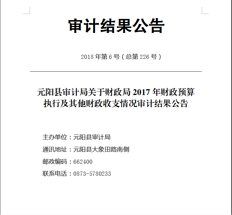 根据《中华人民共和国审计法》第十七条规定,元阳县审计局自2018年3月28日至2018年5月8日,对元阳县财政局组织征收和负责支出安排的2017年地方一般预算收支、基金预算收支、预算外资金收支以及有关股室专户资金收支管理情况进行了审计,现将审计结果公告如下: